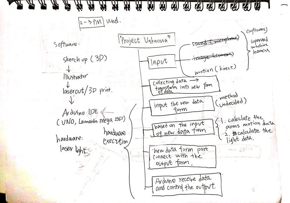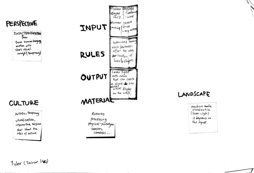 Cultural AI design tools help me to clarify my concept and how i want the machine to work. After dozens of iteration, i finalize my inputs and outputs, which are motions and laser light reflection in a space. The visualization of laser light displayed in a space can express the communication between human and machine.