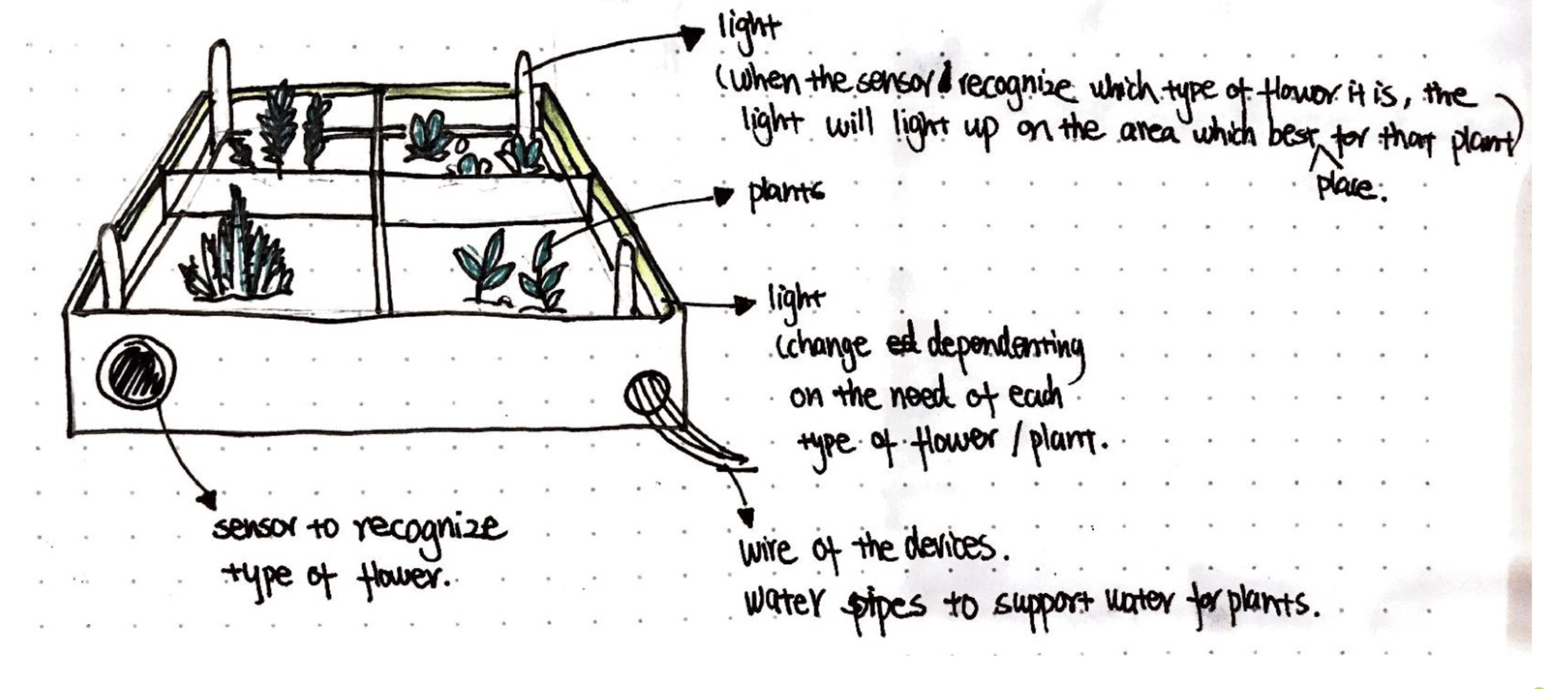 Receive the plant and put it in forint the AI sensor to identify which type the plant is. Then the best pots for the plants to grow will light up, and the user just needs to put the plants into the pot.